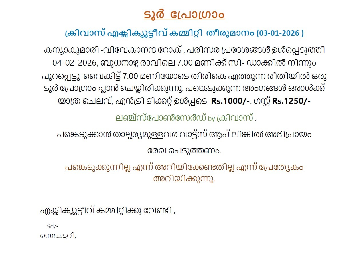A one-day trip to Jatayu Earth’s Center has been arranged for 28th December 2024. The team will depart at 9:00 AM from C-DAC. After visiting Jatayu, the return journey will include stops at Muthalapozhi and Anjuthenku Fort for short visits. Travel will be by an air-conditioned bus. The trip cost, covering bus fare and the entry fee at Jatayu (including ropeway charges), is ₹1,000 per head for members and their spouses, and ₹1,300 for others. Lunch and refreshment expenses will be covered by CREWAS.